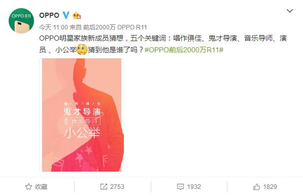 今天,OPPO官方微博出文公布明星家族新组员猜测,五个关键字:唱作出众、天才电影导演、歌曲老师、知名演员、小仙女。据推断,新品牌代言人就是周董。