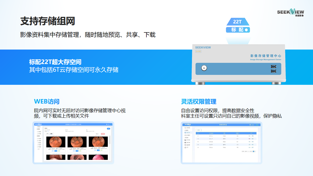 对于影像量庞大的科室或医院,单机存储仍显不足。索图提供集中存储管理中心,标配22TB本地存储,并含6TB云端长期归档空间。所有录像统一纳管,支持在线查看、在线编辑、权限分配与合规调阅,真正实现“录得下、存得住、找得到、用得好”。