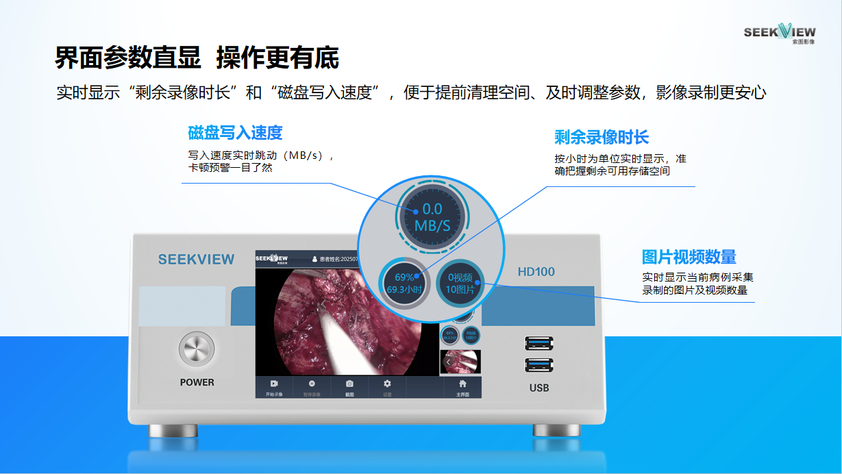 市面上多数医用刻录机只标配500GB–1TB存储空间,在4K录制模式下可能只支持数小时录像。而索图的高清刻录机标配4TB(可扩展至8TB);4K机型更直接标配8TB,是行业平均水平的4–8倍。这意味着一台设备即可连续录制数十小时高清手术视频,大幅减少因空间不足导致的中断风险,能一定程度满足科室的日常存储需求。