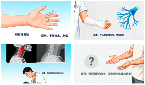 周围神经病变:如糖尿病性周围神经病(手脚麻木、刺痛)、腕管综合征(手指麻木、夜间加重)、坐骨神经痛等,可判断神经受损程度与范围;