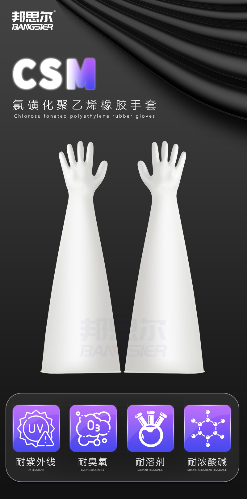 氯磺化聚乙烯(CSM)橡胶手套作为干箱专用防护装备,在生物制药领域价值凸显。制药过程中,浓硝酸类、浓盐酸等强氧化性制剂频繁使用,该手套的材质特性可有效抵御,保障操作人员免受伤害,同时防止试剂污染药品。在手套箱等箱体设备操作时,其精准的参数设计,如多种袖口直径(160/180/200/228/250MM)适配不同箱体接口,800 + MM长度覆盖手臂,光滑表面便于操作箱内精密部件,高气密性维持箱内惰性气体环境,助力实验与生产顺利进行。科研实验室里,从基础化学实验到前沿生物研究,耐紫外线灭菌、耐多种氧化化学制剂的性能,满足实验对防护的严苛要求,让科研人员专注实验。食品加工行业,处理涉及化学制剂的环节,如设备消毒、原料腌制,该手套的耐化学性与卫生性,契合食品生产标准,守护食品质量。化学品处理场景,面对高温、强腐蚀工况,其温度适应范围与抗臭氧性能,为操作安全护航,在干箱作业全链条发挥关键防护作用 。