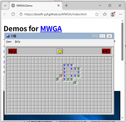 后来我们对旧代码修改了不超过50行(占比2%)就让同一套代码可以无需修改即可编译成.exe和.wasm文件。然后编译成.wasm的扫雷程序在谷歌浏览器中的运行结果如下: