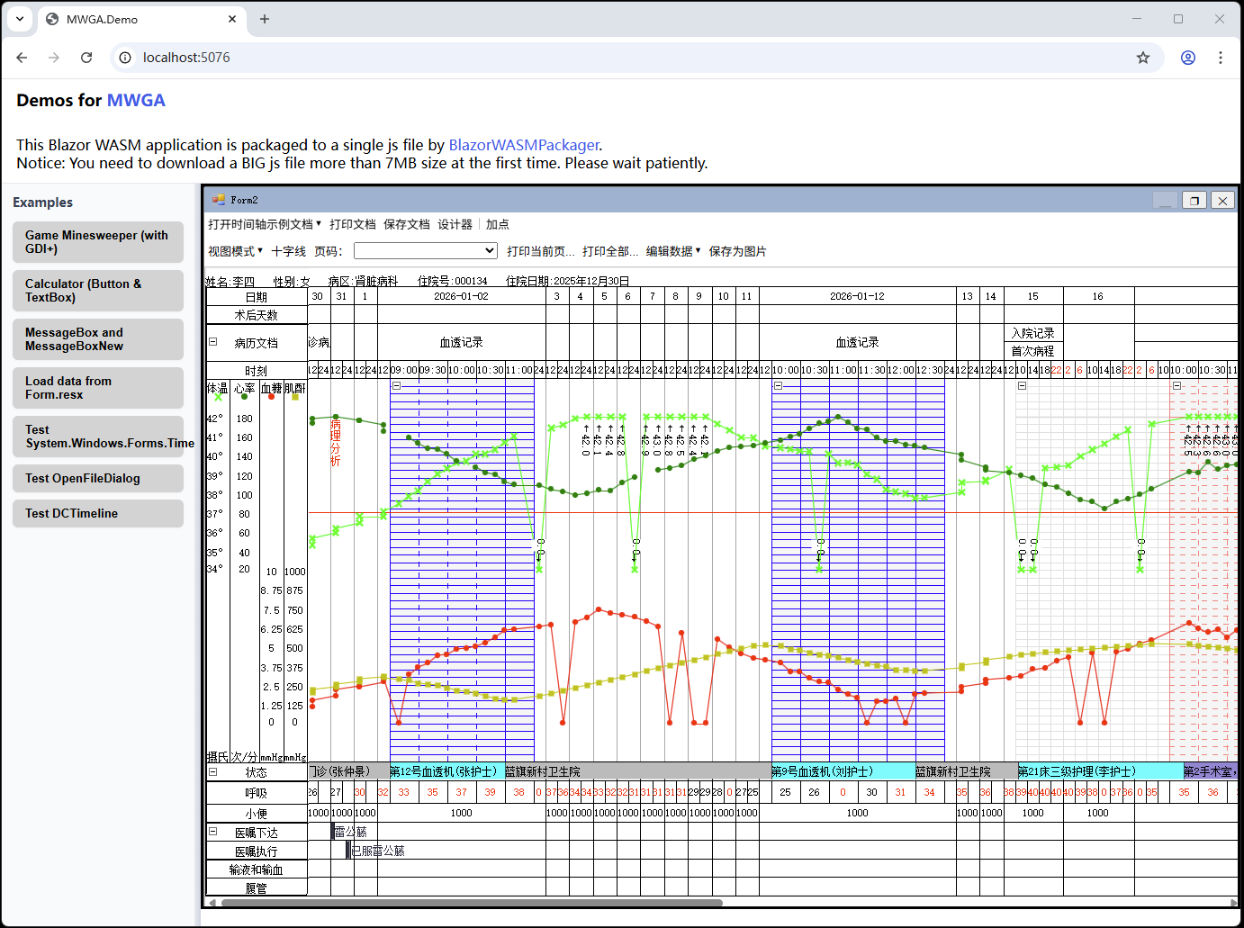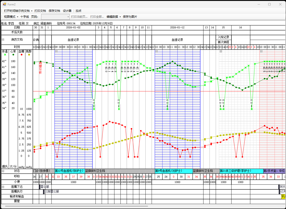 时间轴产品是南京都昌公司的一个WinForms软件产品,现已开源,这是一个面向医院的专业软件产品,可以认为是体温单软件的增强版,它包含了7万行C#代码,其中有数万行GDI+绘图相关代码,其运行界面如下图所示: